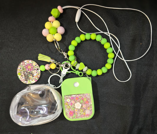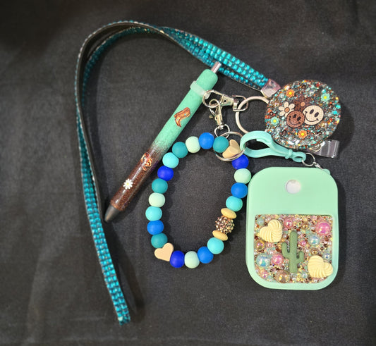 Includes: keychain, wristlet, mini zipper bag, small bling bottle