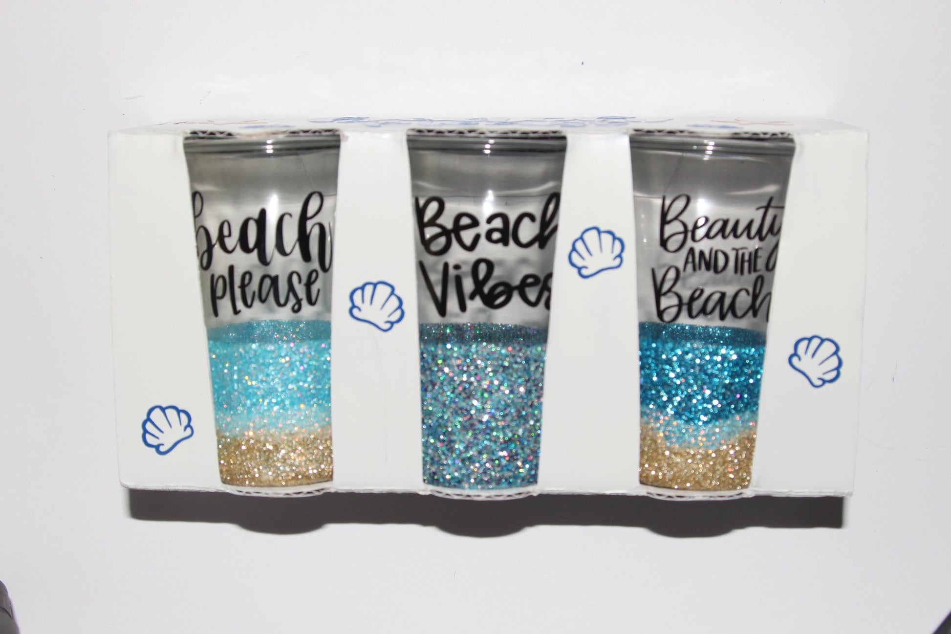 This fun glitter shot glass set are the best way to bring some sparkle and joy out of that next shot. They make the perfect gift or party favor for a birthday bash, bachelorette party, wedding party, and more. The glitter is sealed. The set includes 3 - 1.5 oz. shot glasses with matching themed packaging.